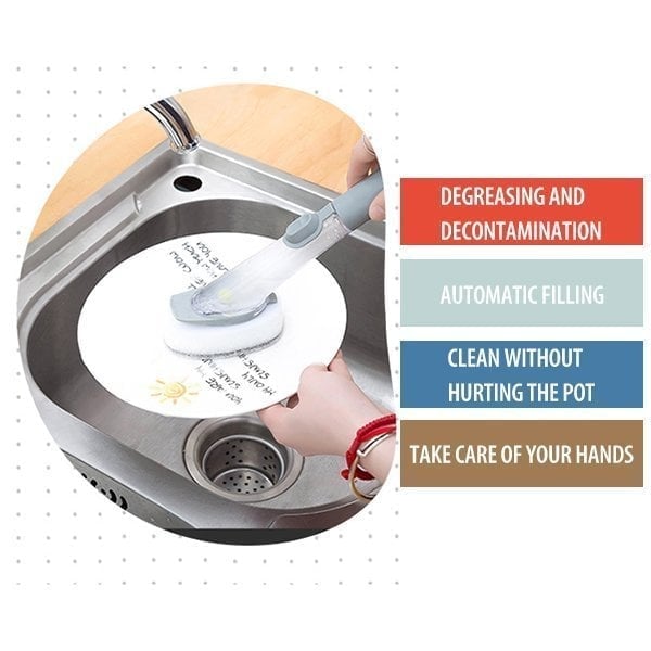【Soap Dispensing】 Kitchen scrub brush is equipped with a 50ML super-large-capacity dispenser, and dispenses soap on demand with the light push of a button. No matter how placed, the silicone valve can prevent the dish soap from leaking