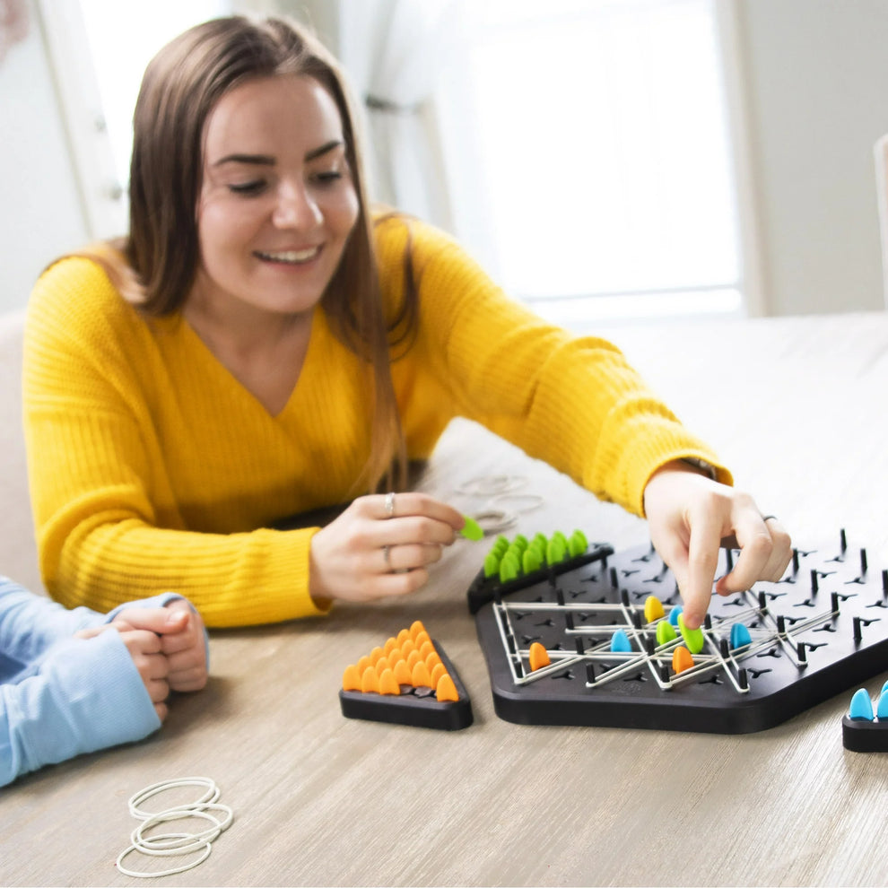 🧵 Stretch rubber bands across the pegs to complete shapes or block your opponent.